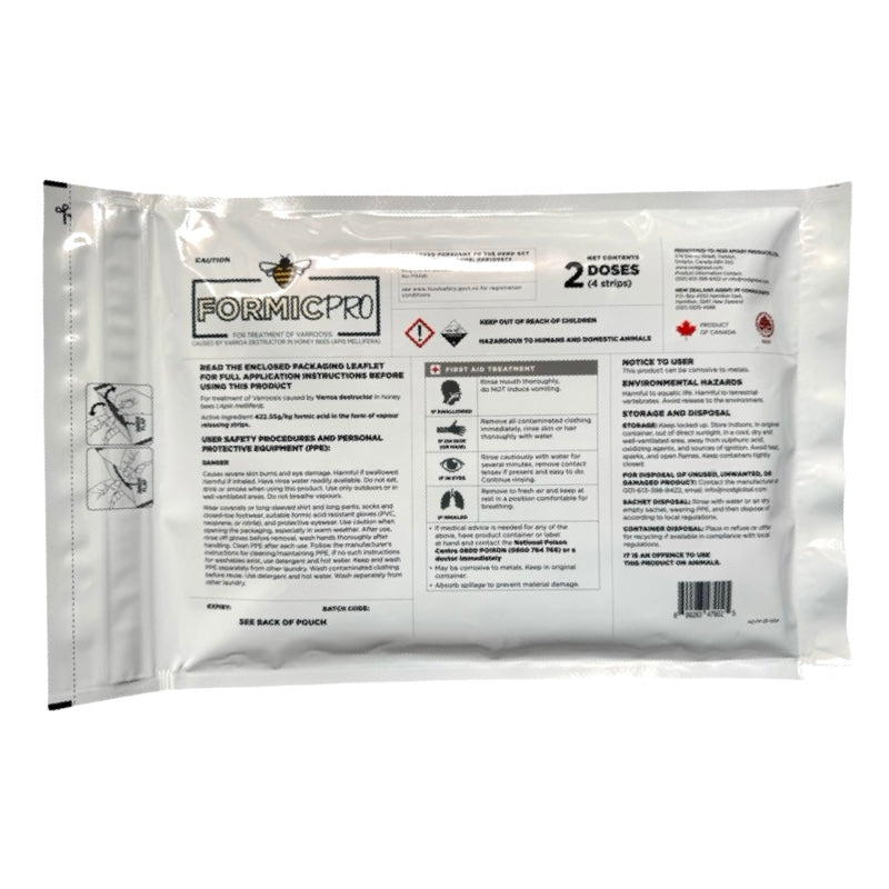 Formic Pro is an organic, non-synthetic varroa mite treatment designed specifically for use in honeybee hives. Its active ingredient is formic acid, delivered via ready-to-use gel strips that release vapours slowly to target mites at all life stages — both on adult bees and beneath the brood caps.